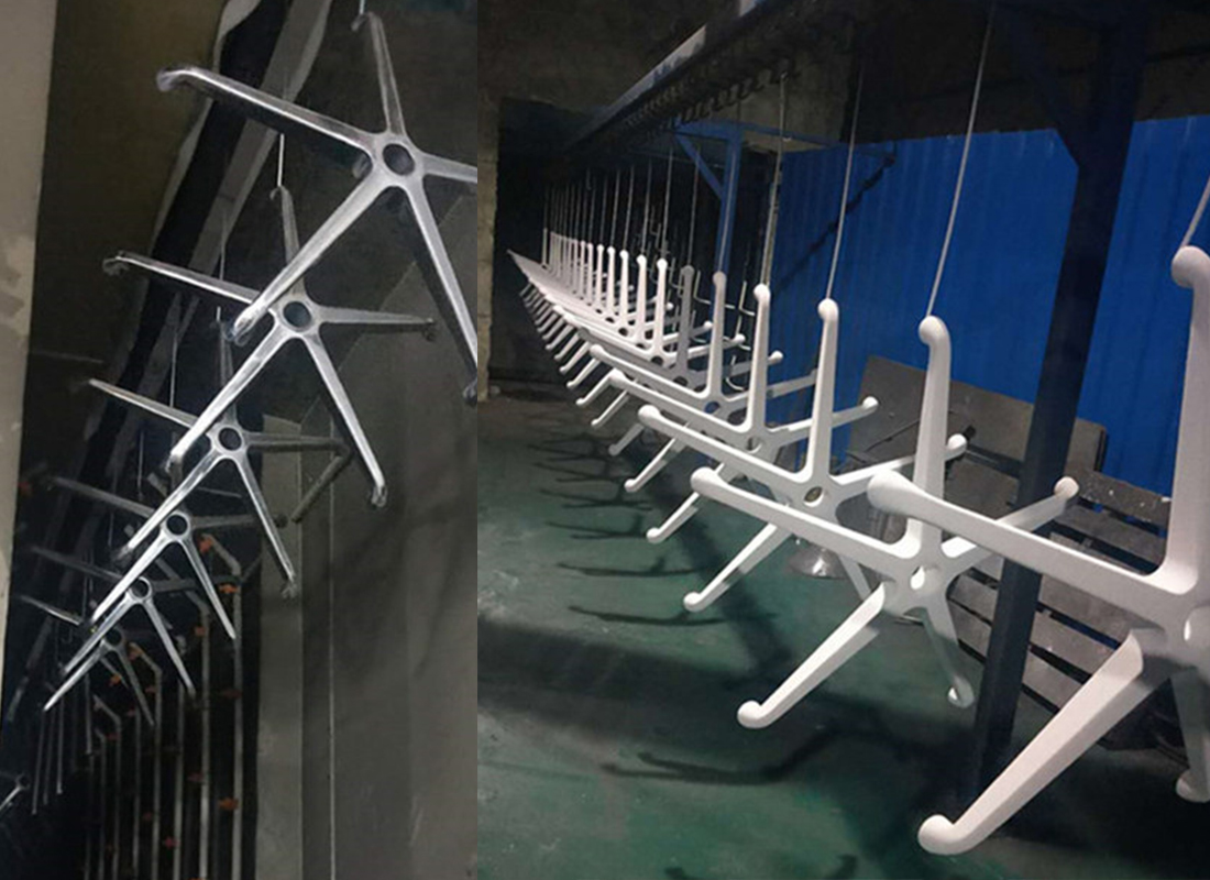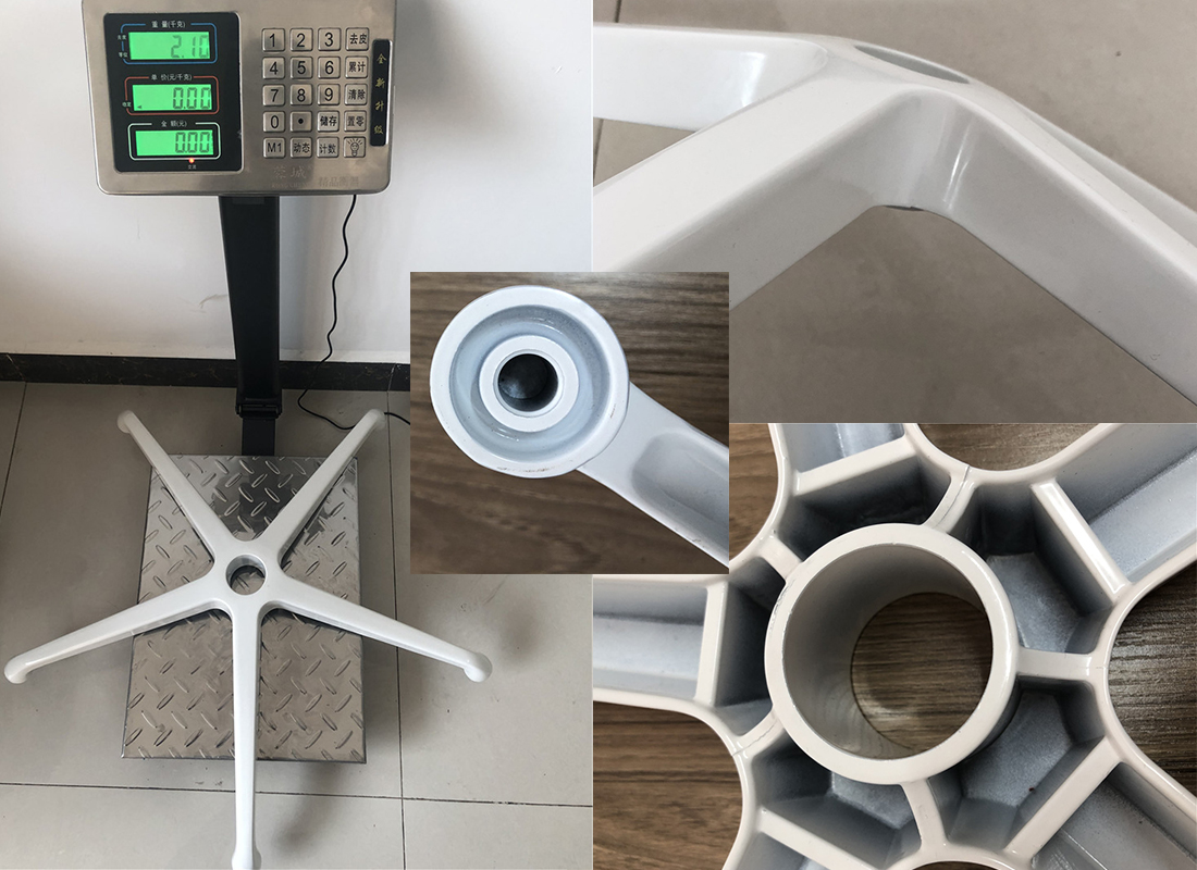 A: Aluminum alloy chair bases are anti-rust, stable in structure, and the best bearing capacity. Aluminum chair base parts have chromed surface treatment, polish and powder coating surface treatment, and painted surface treatment which can be used for outdoor furniture or high-end chairs. Iron metal chair bases can be made in various shapes with designs , and cheaper than aluminum alloy chair bases, two kinds of surface treatment are Chromed and powder coated. The disadvantage is easy to rust after a long time of use or in a wet environment. Nylon base also called plastic chair base is lightweight and cheap price than aluminum and Iron metal base. The bearing capacity is not as good as aluminum alloy and metal iron chair base parts, the lifetime is shorter than iron metal and aluminum alloy base parts