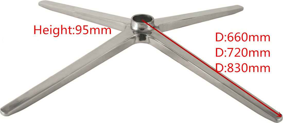 A: Aluminum alloy chair bases are anti-rust, stable in structure, and the best bearing capacity. Aluminum chair base parts have chromed surface treatment, polish and powder coating surface treatment, and painted surface treatment which can be used for outdoor furniture or high-end chairs. Iron metal chair bases can be made in various shapes with designs , and cheaper than aluminum alloy chair bases, two kinds of surface treatment are Chromed and powder coated. The disadvantage is easy to rust after a long time of use or in a wet environment. Nylon base also called plastic chair base is lightweight and cheap price than aluminum and Iron metal base. The bearing capacity is not as good as aluminum alloy and metal iron chair base parts, the lifetime is shorter than iron metal and aluminum alloy base parts