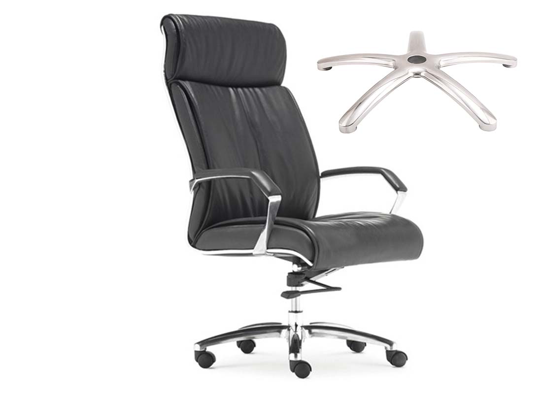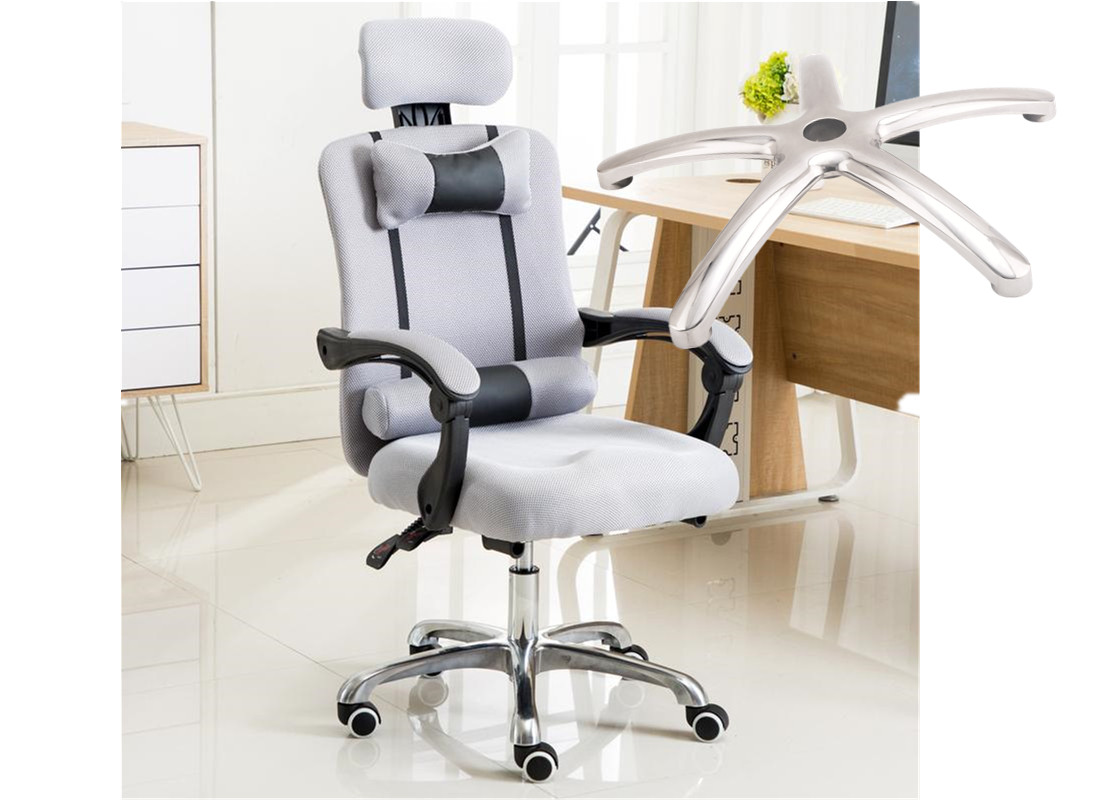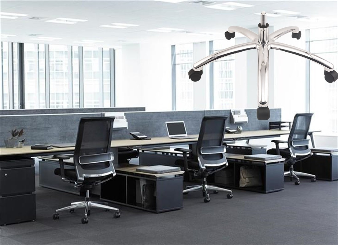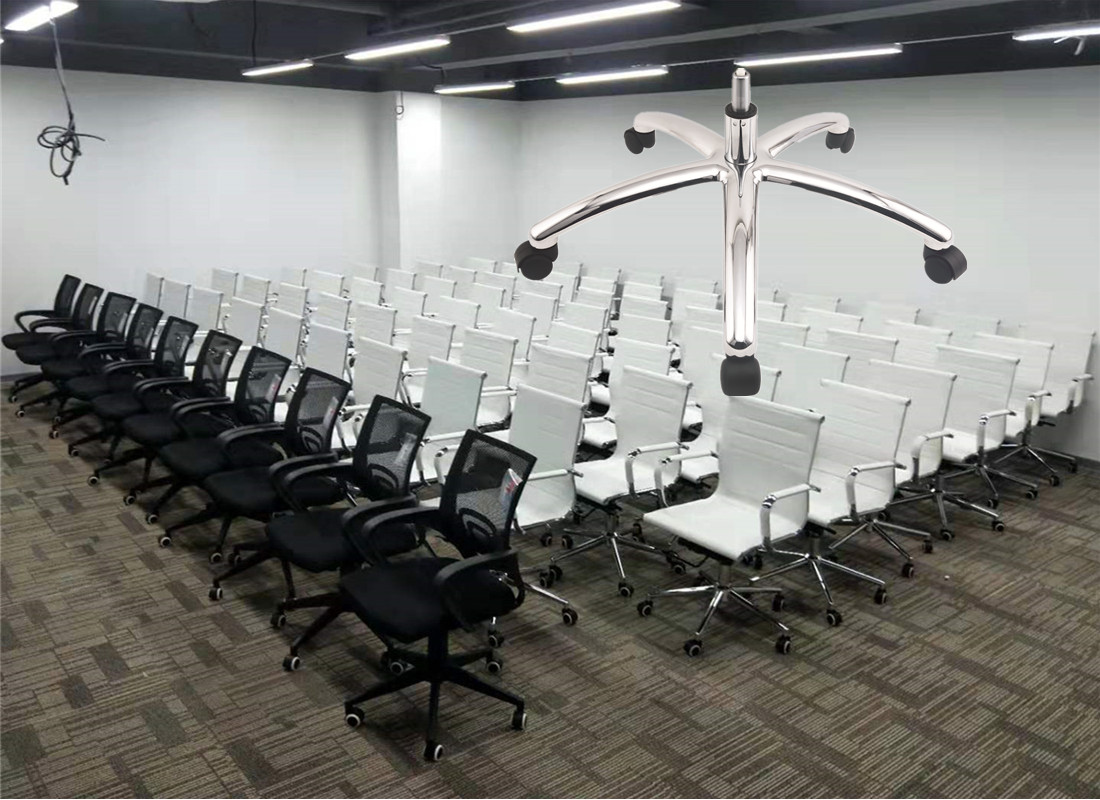 A: Aluminum alloy chair bases are anti-rust, stable in structure, and the best bearing capacity. Aluminum chair base parts have chromed surface treatment, polish and powder coating surface treatment, and painted surface treatment which can be used for outdoor furniture or high-end chairs. Iron metal chair bases can be made in various shapes with designs , and cheaper than aluminum alloy chair bases, two kinds of surface treatment are Chromed and powder coated. The disadvantage is easy to rust after a long time of use or in a wet environment. Nylon base also called plastic chair base is lightweight and cheap price than aluminum and Iron metal base. The bearing capacity is not as good as aluminum alloy and metal iron chair base parts, the lifetime is shorter than iron metal and aluminum alloy base parts