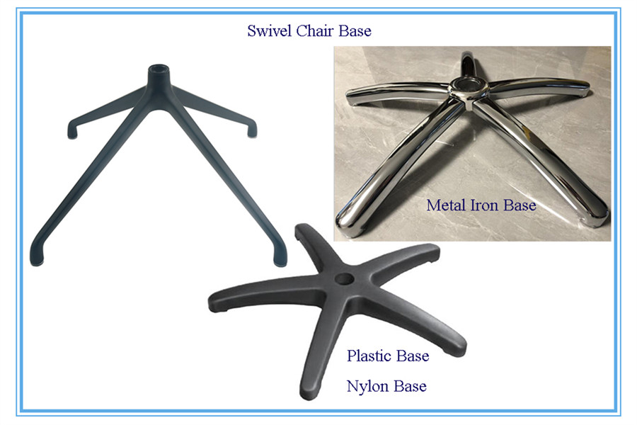 The swivel chair base is the bottom part of the swivel chair, where the user sits. swivel chair base is typically made of metal iron,metal aluminum or plastic and is designed to provide stability and support for the chair. Some swivel chairs have a stationary base, while others have a rotating base that allows users to turn the chair in different directions.