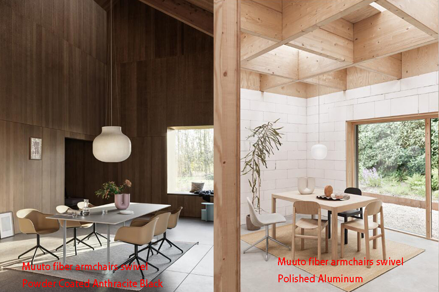 Muuto fiber armchairs swivel base are made of Aluminum with both Powder Coated and polished surface treatment.