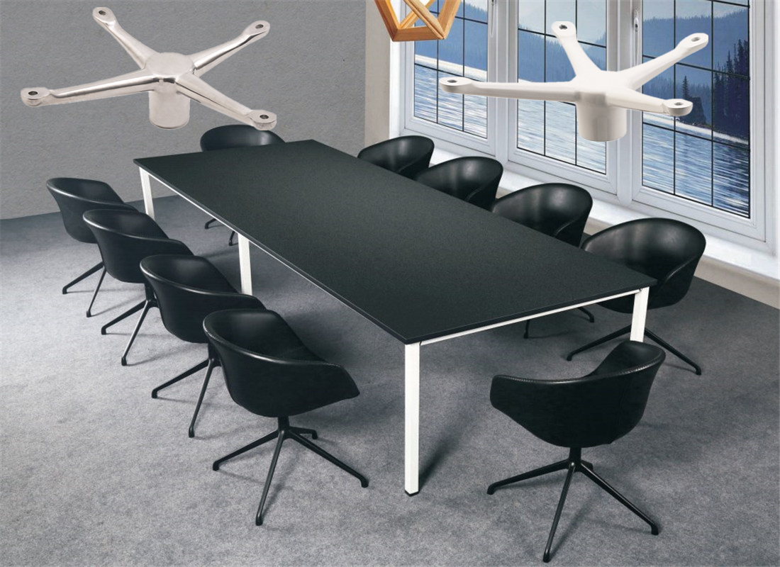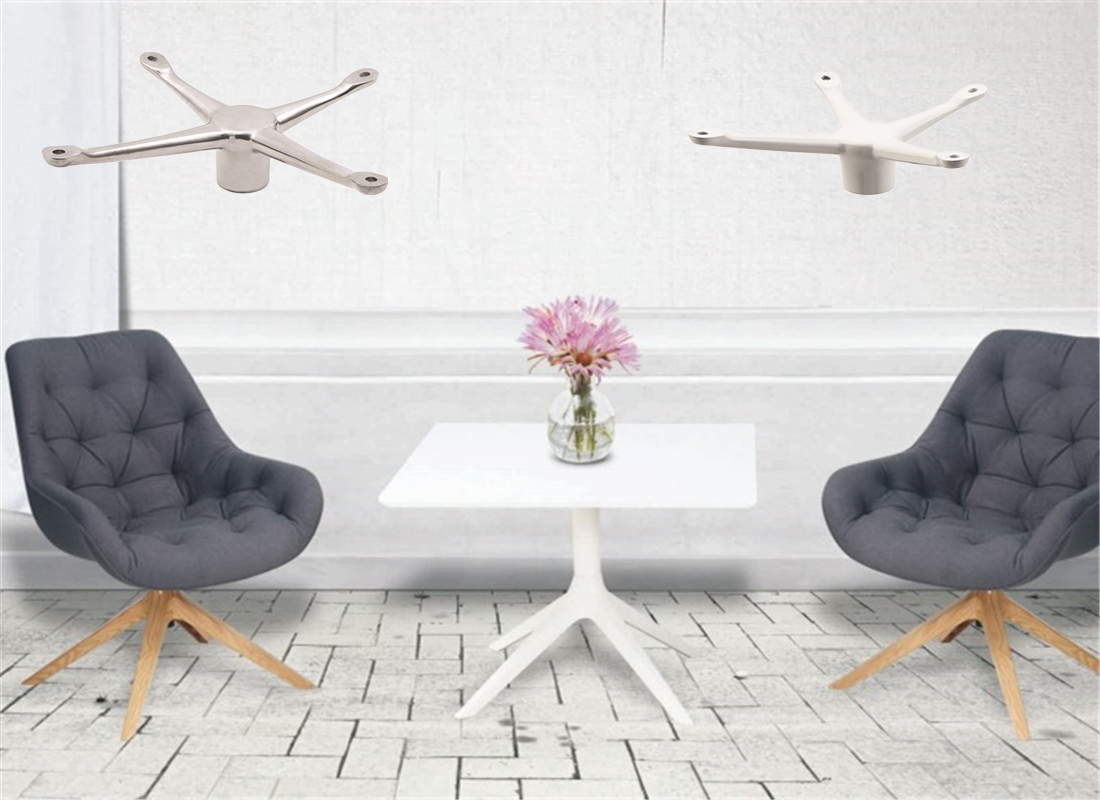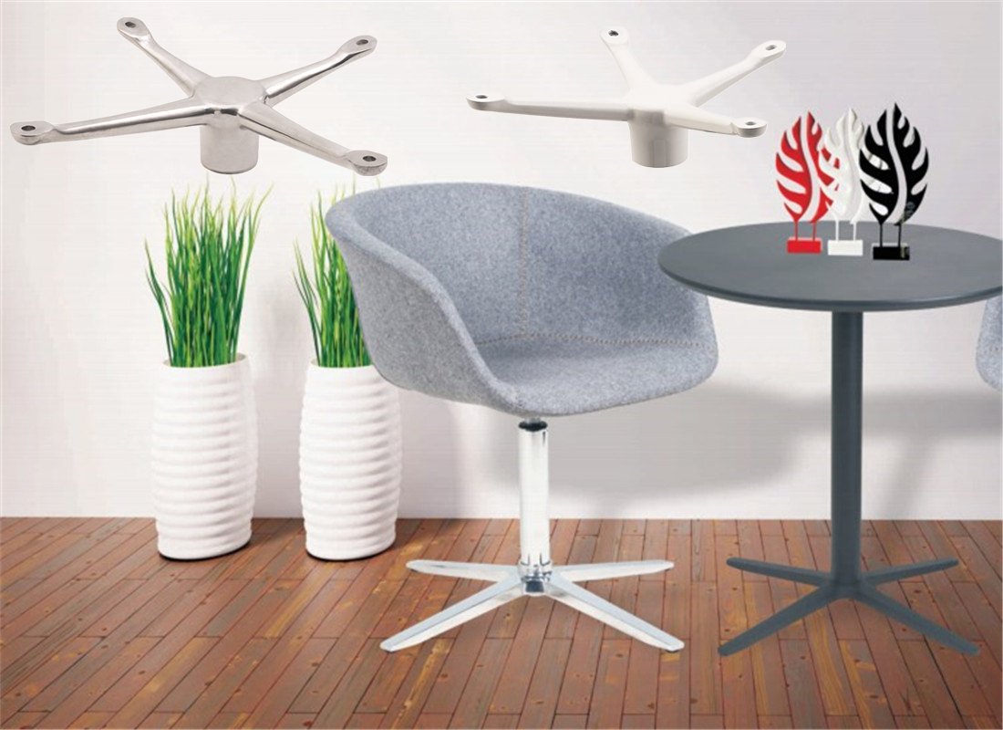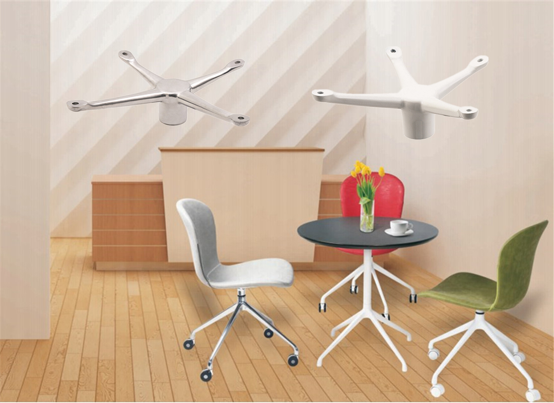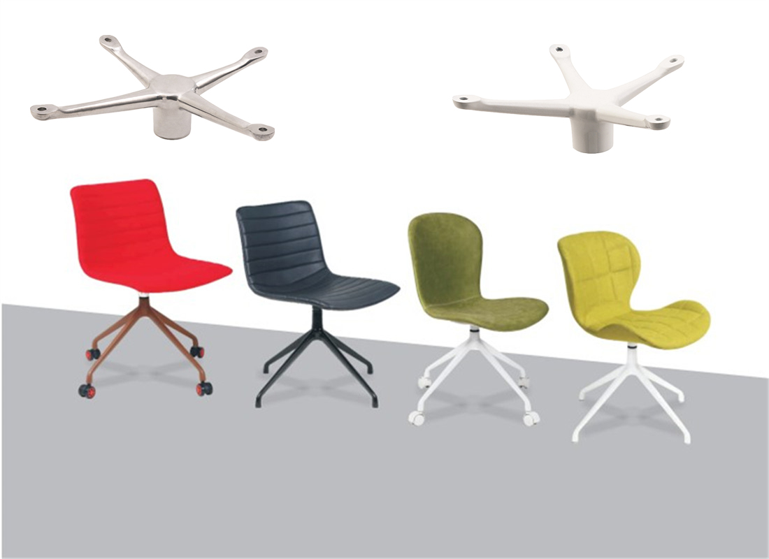A: Aluminum alloy chair bases are anti-rust, stable in structure, and the best bearing capacity. Aluminum chair base parts have chromed surface treatment, polish and powder coating surface treatment, and painted surface treatment which can be used for outdoor furniture or high-end chairs. Iron metal chair bases can be made in various shapes with designs , and cheaper than aluminum alloy chair bases, two kinds of surface treatment are Chromed and powder coated. The disadvantage is easy to rust after a long time of use or in a wet environment. Nylon base also called plastic chair base is lightweight and cheap price than aluminum and Iron metal base. The bearing capacity is not as good as aluminum alloy and metal iron chair base parts, the lifetime is shorter than iron metal and aluminum alloy base parts